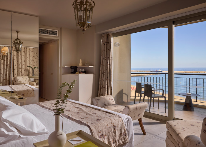 The Mythica Deluxe Room offers additional space and refinement, with panoramic sea-front views of Rethymno’s old town and harbor. From your own private veranda, you can enjoy both sunrise and sunset, immersing yourself in serenity and the beauty of the surroundings. The luxurious marble bathroom features either a Jacuzzi bathtub or a walk-in shower with jet, providing the perfect balance of comfort and elegance.